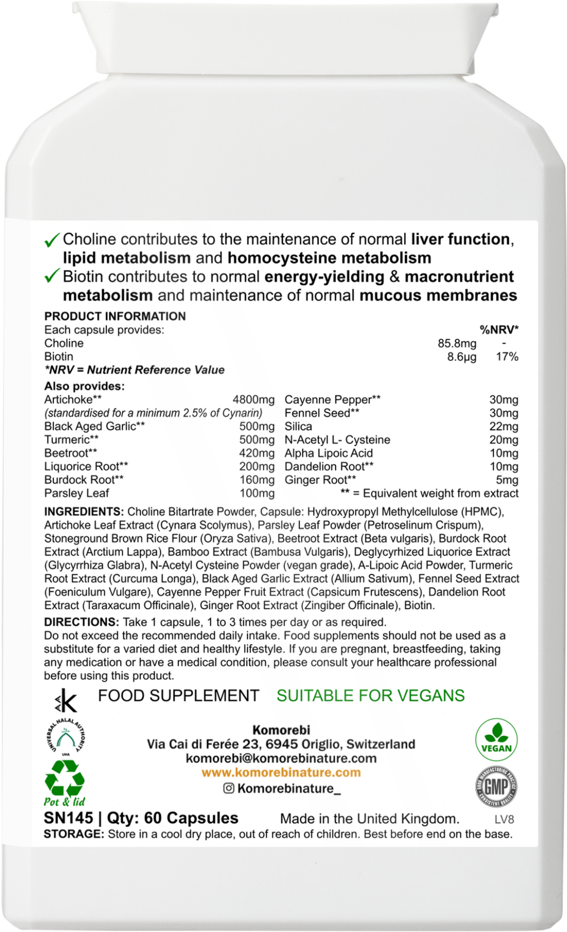"Liver detox and cellular protection with choline, NAC, antioxidants, and herbal extracts"