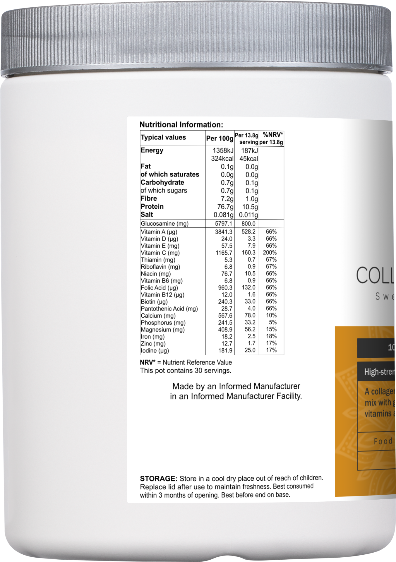 ✔️ Hydrolysed collagen peptides (10,000mg per serving): High bioavailability to support skin, joints, and muscle structure