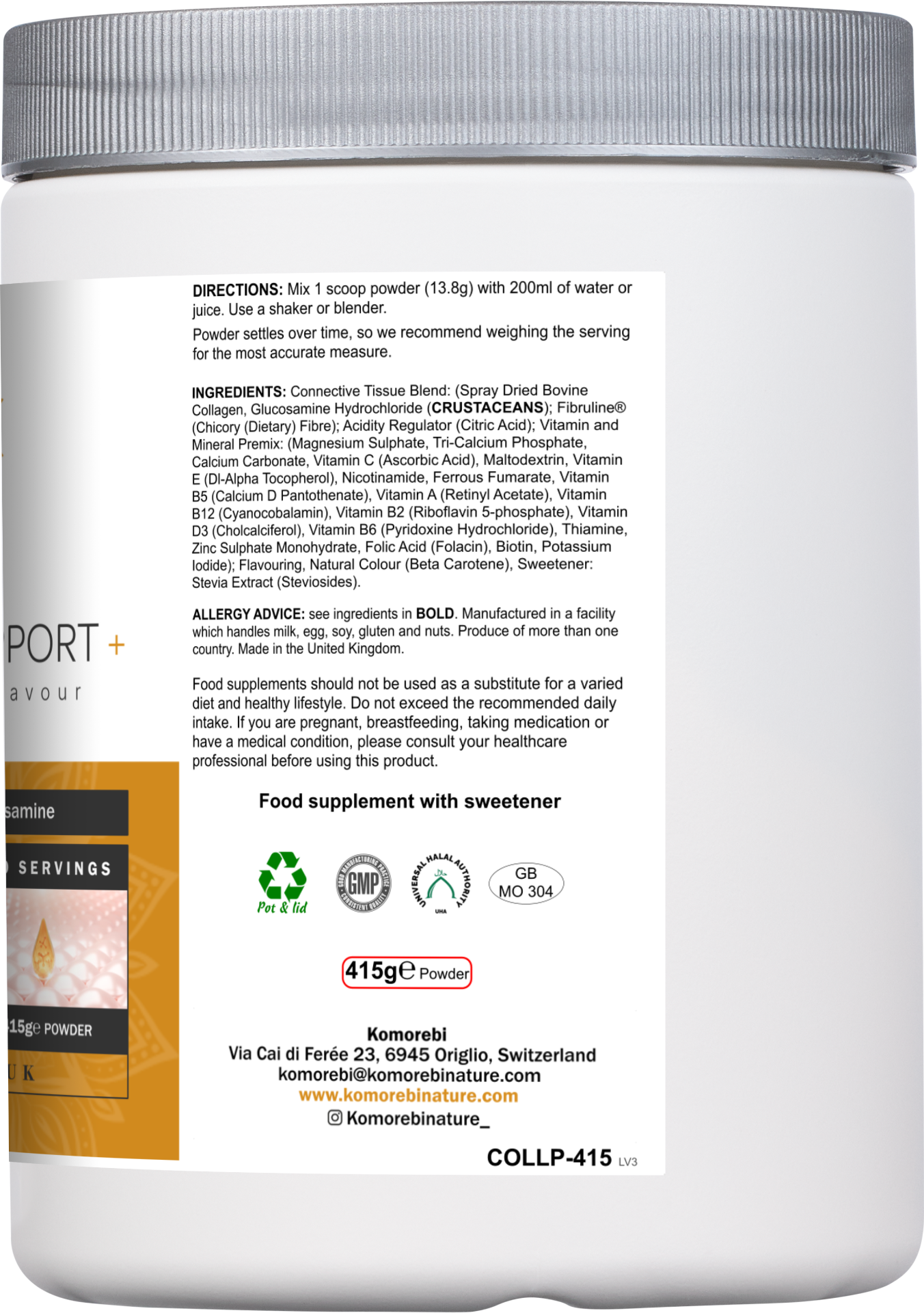 Collagen Support+ is a high-potency blend designed to support the health of your skin, hair, nails, joints, and muscles. With 10g of hydrolysed collagen per serving, this formula enhances collagen production, boosts elasticity, improves hydration, and supports tissue repair.