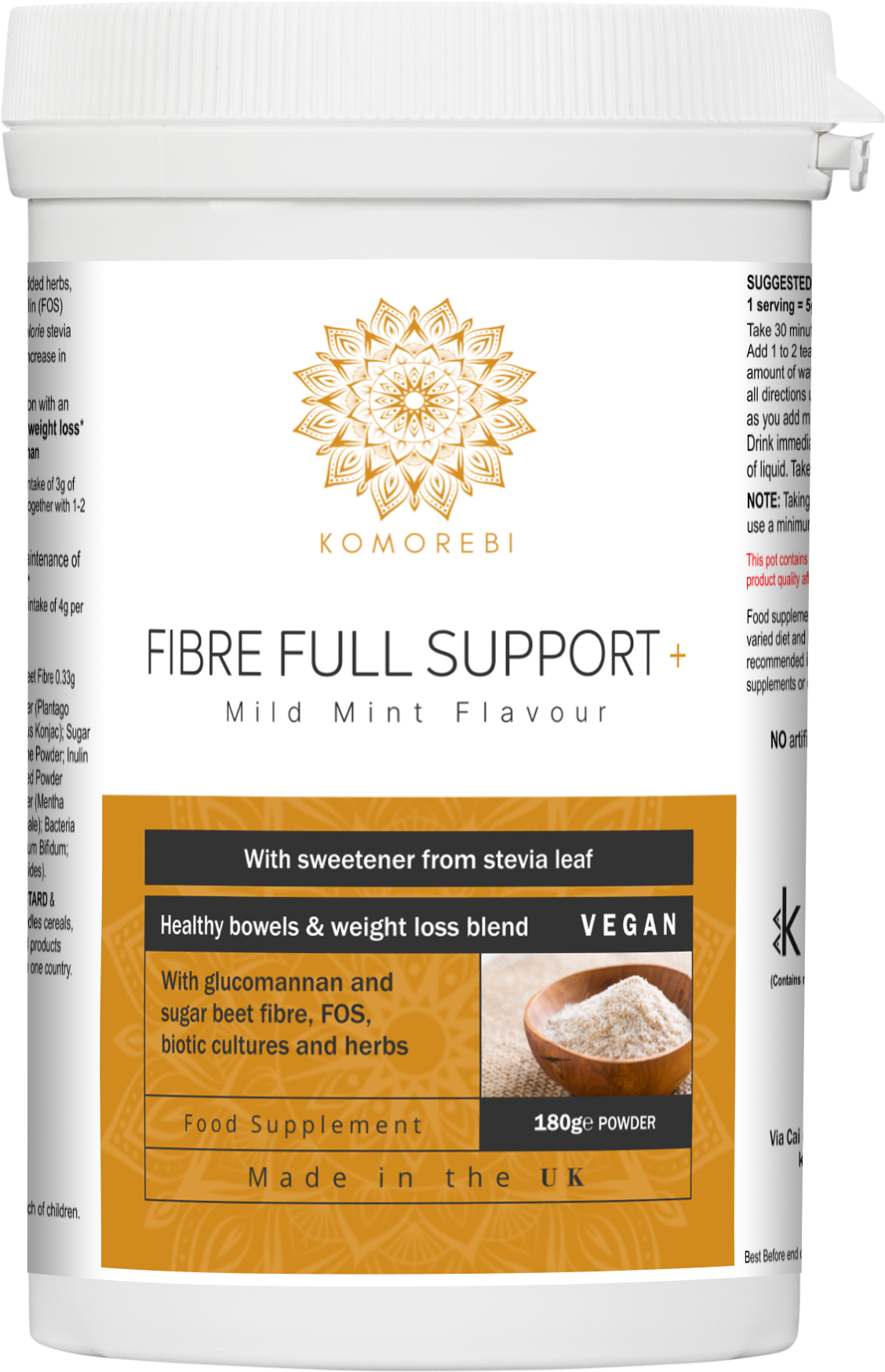 Fibre Full Support+ is a high-fibre, easy-to-mix powder designed to cleanse the colon, support digestion, and aid weight balance. The formula includes natural bulking agents, prebiotic fibres, and friendly bacteria to restore intestinal harmony.