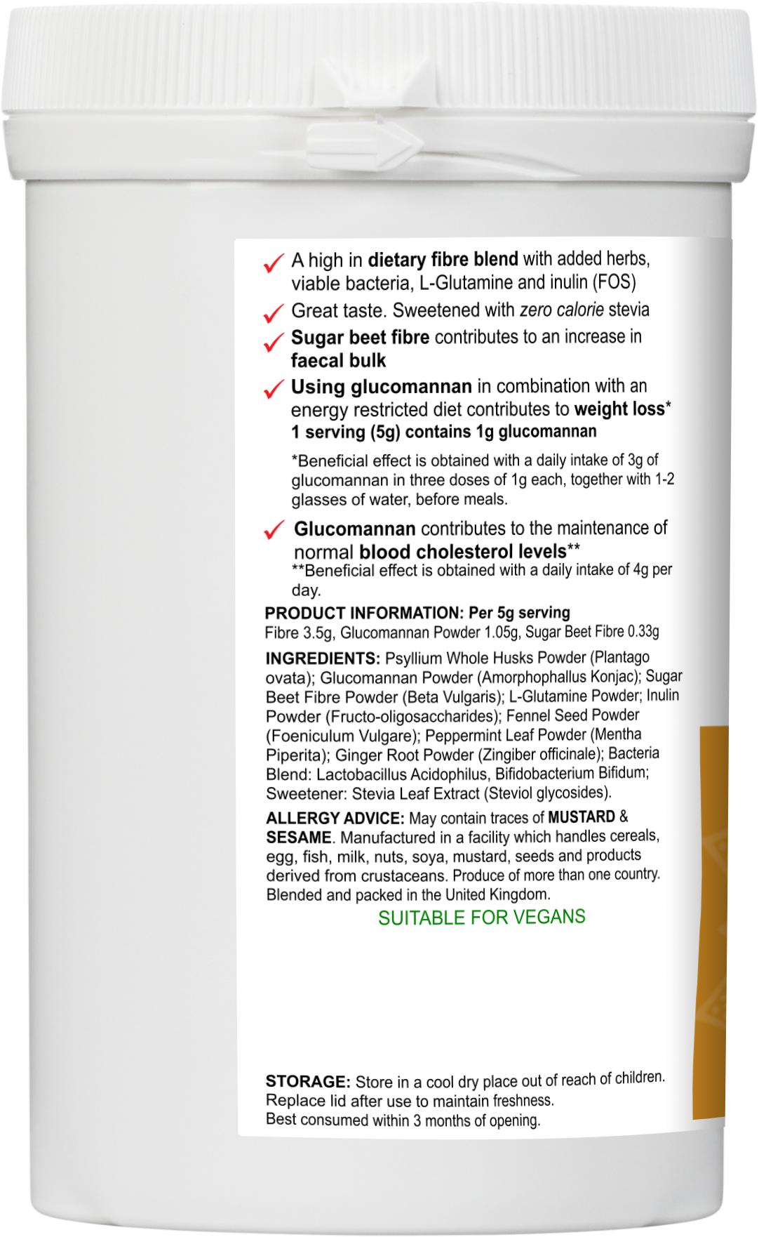 Glucomannan contributes to satiety and weight loss when taken before meals with plenty of water, while sugar beet fibre helps increase faecal bulk through both mechanical action and fermentation. L-Glutamine supports intestinal lining repair and overall gut health.