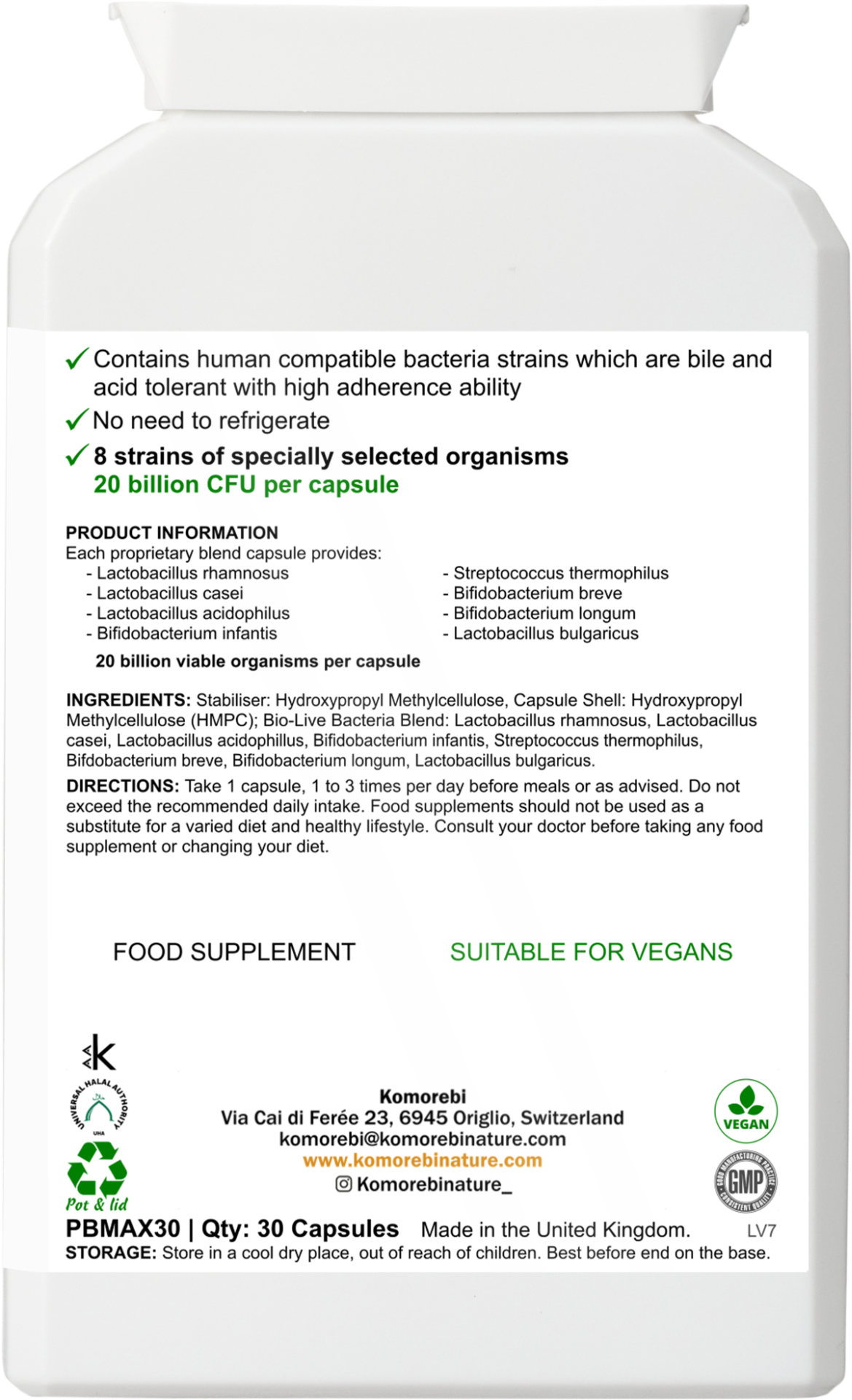 Probiotic strains: Lactobacillus acidophilus, L. rhamnosus, L. casei, L. plantarum, Bifidobacterium breve, B. bifidum, Streptococcus thermophilus, L. bulgaricus