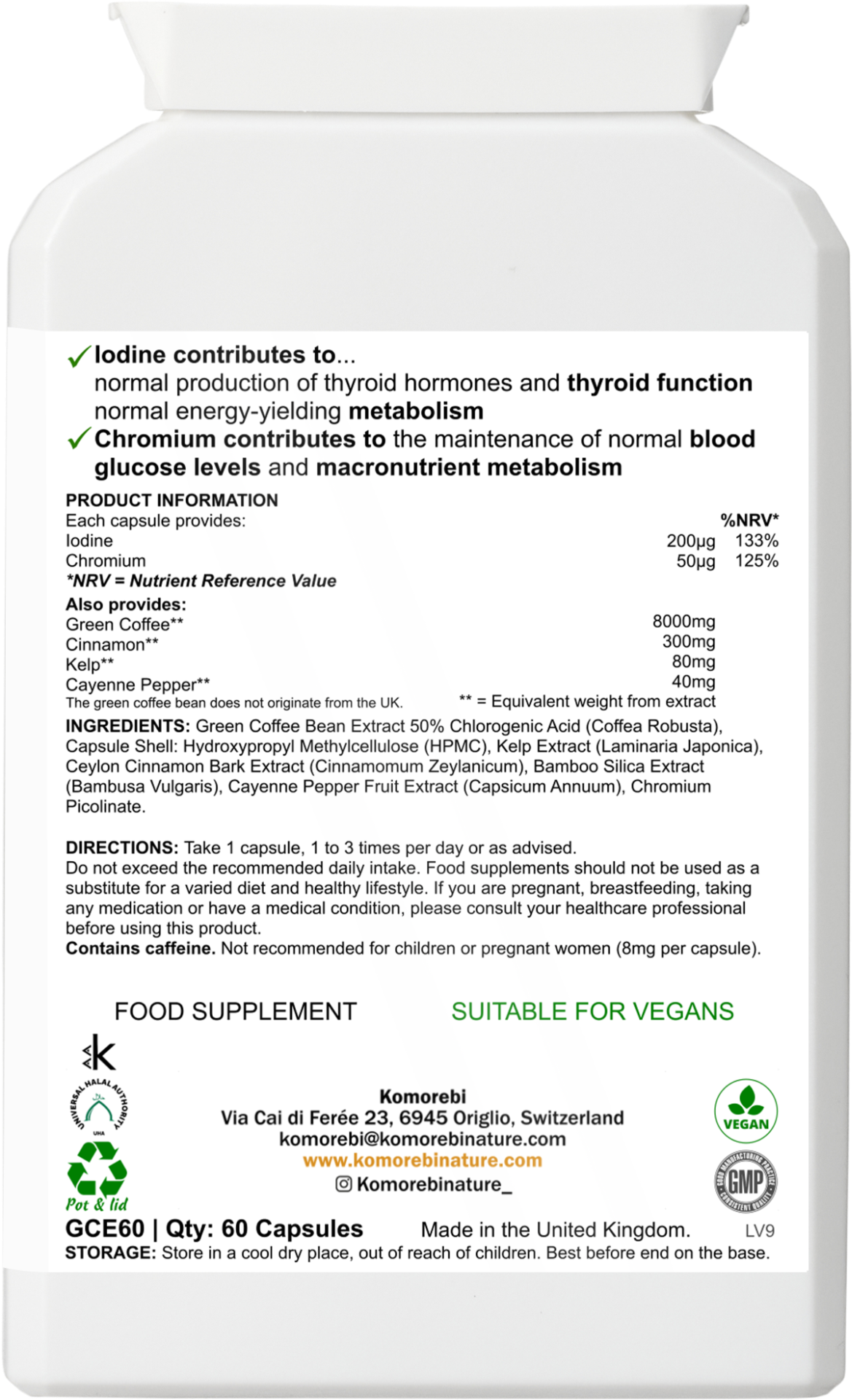 ✔️ Active natural extracts: Green coffee (8000mg – 50% chlorogenic acid), kelp (bladderwrack), cinnamon, cayenne pepper (420mg)
