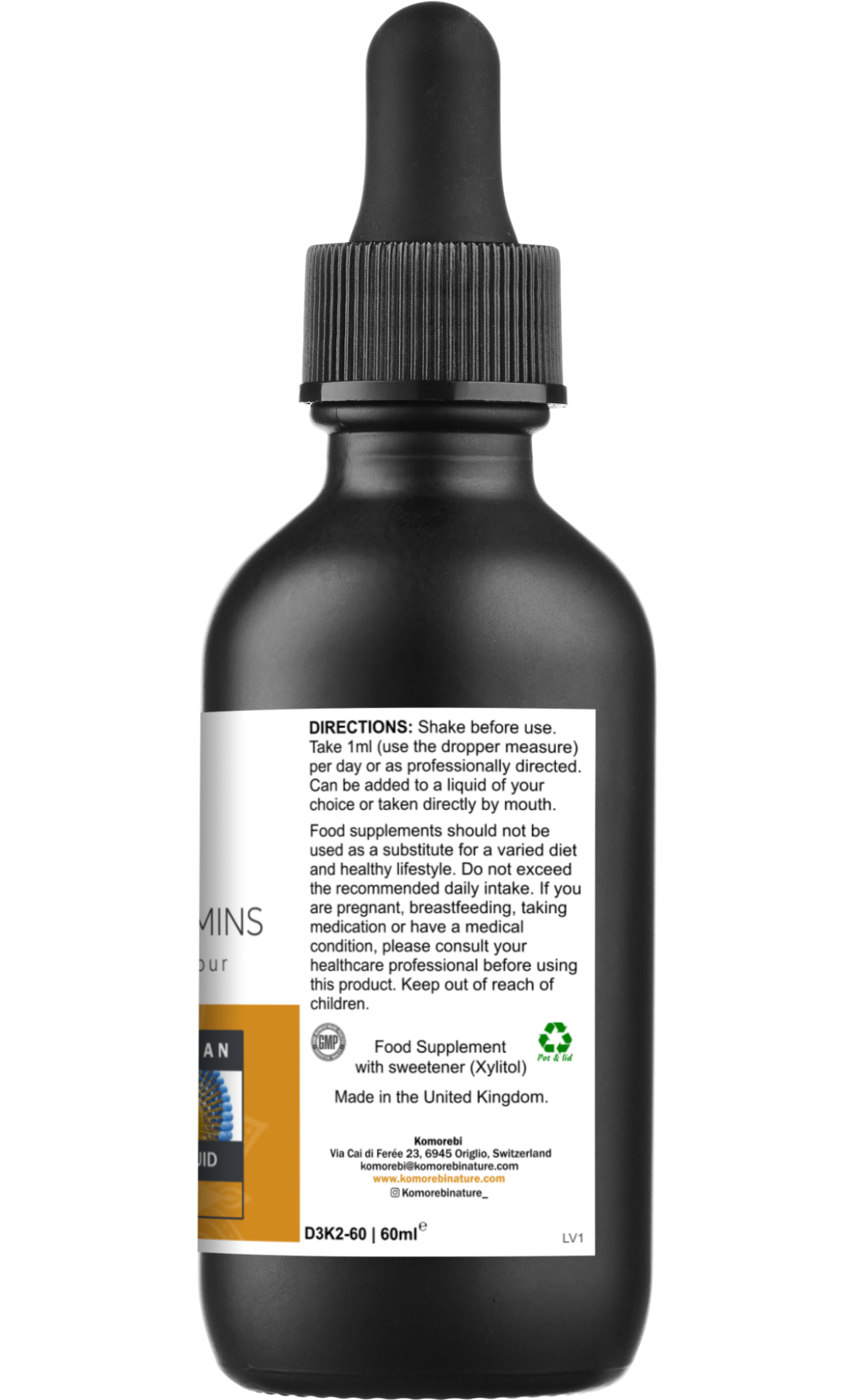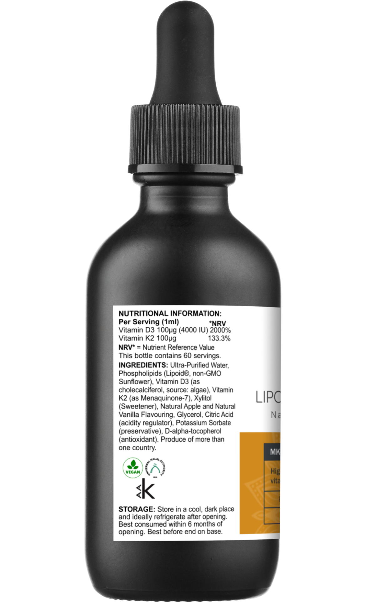 Key ingredients: Vitamin D3 (cholecalciferol from algae, 4000 IU/ml), Vitamin K2 (Menaquinone-7, MK-7, 100 μg/ml, highly bioavailable), non-GMO sunflower phospholipids (Lipoid®), ultra-purified pharmaceutical grade water (Type 1).